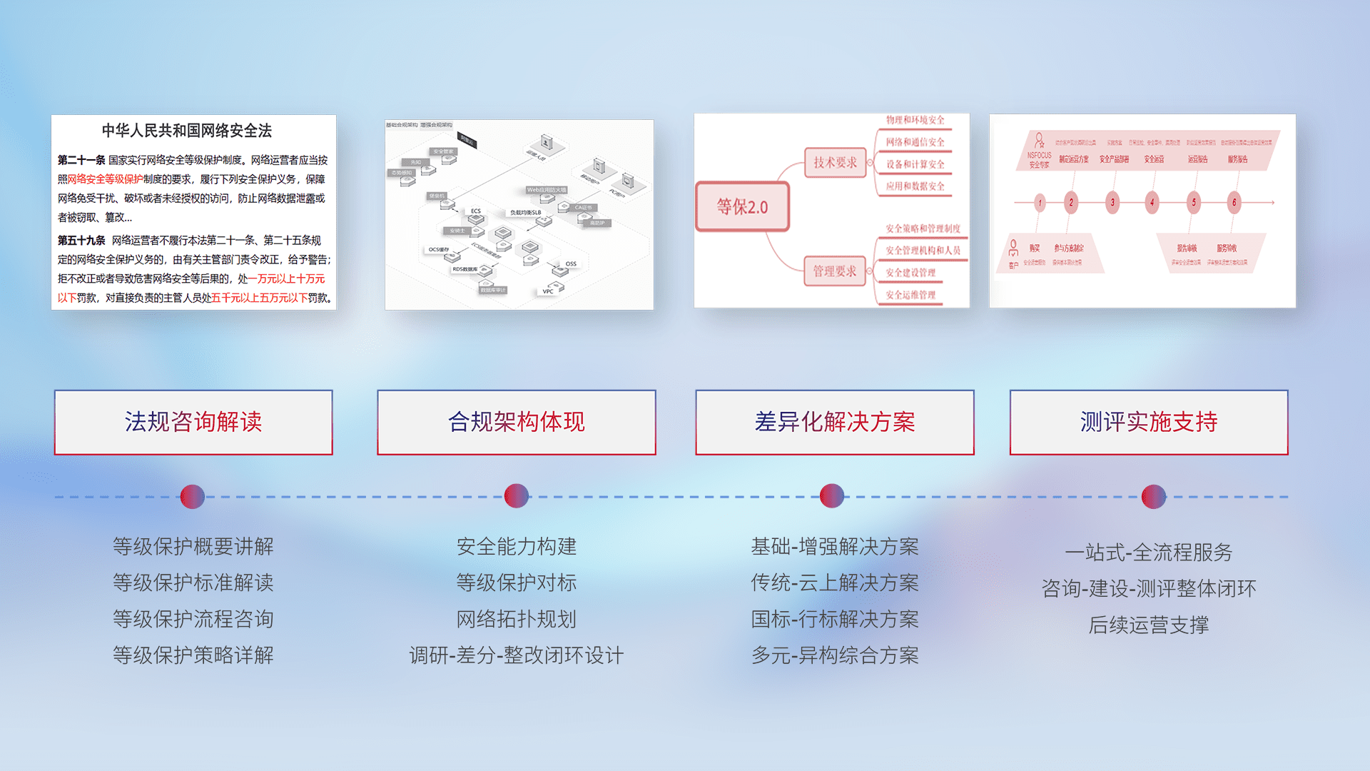 通过专业的法律咨询解读、、、、合规架构体现、、、、差异化解决方案、、、测试实施支持等服务,,,为客户量身打造等保合规体系。。。