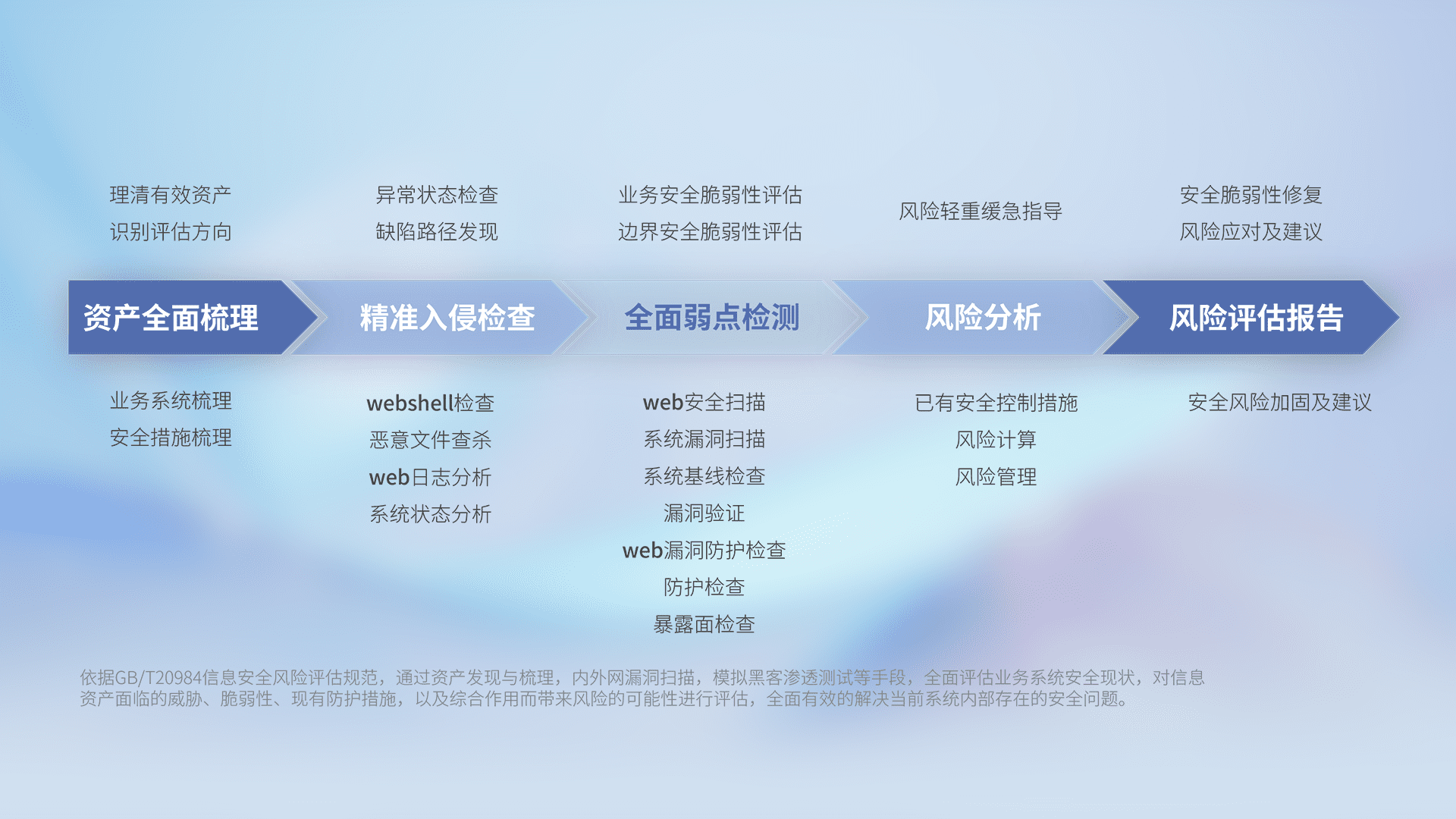 针对客户行业特性,,,,以专业的安全服务+多厂商联合解决方案提供专属的一站式安全管理服务,,,帮助客户全面感知网络空间威胁,,,基于识别、、、检测、、分析、、、防护、、监测、、响应的服务理论模型,,,,从方案咨询、、、集成交付、、、、评估验证、、优化加固、、、、运维运营,,,,致力于为客户提供完整的闭环管理式安全服务。。。。以实战经验为客户打造高抵御风险的安全体系,,帮助客户发现威胁、、对抗威胁、、、处置威胁,,,,不断积累安全对抗能力,,,,持续保障数字化安全。。。。